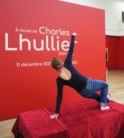Debout, assise, bras pliés, allongée, à genou… une médiatrice prend la pose dans la nef du musée : à toi de la dessiner.