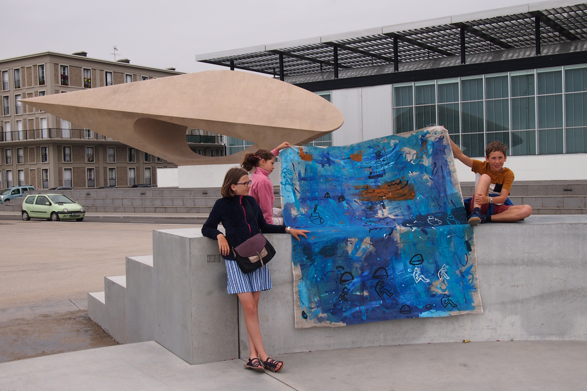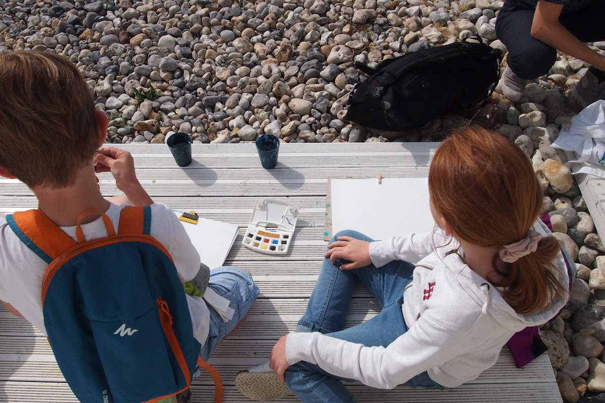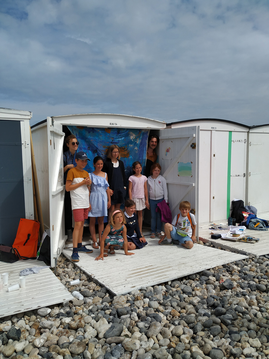 Après une visite de l’exposition Dufy au Havre et deux matinées de peinture dans l’atelier, les enfants ont rejoint la plage et la cabane Première ligne de Flora et Simon. L’occasion pour eux de sortir du musée pour s’inspirer des paysages de la plage et créer autrement !