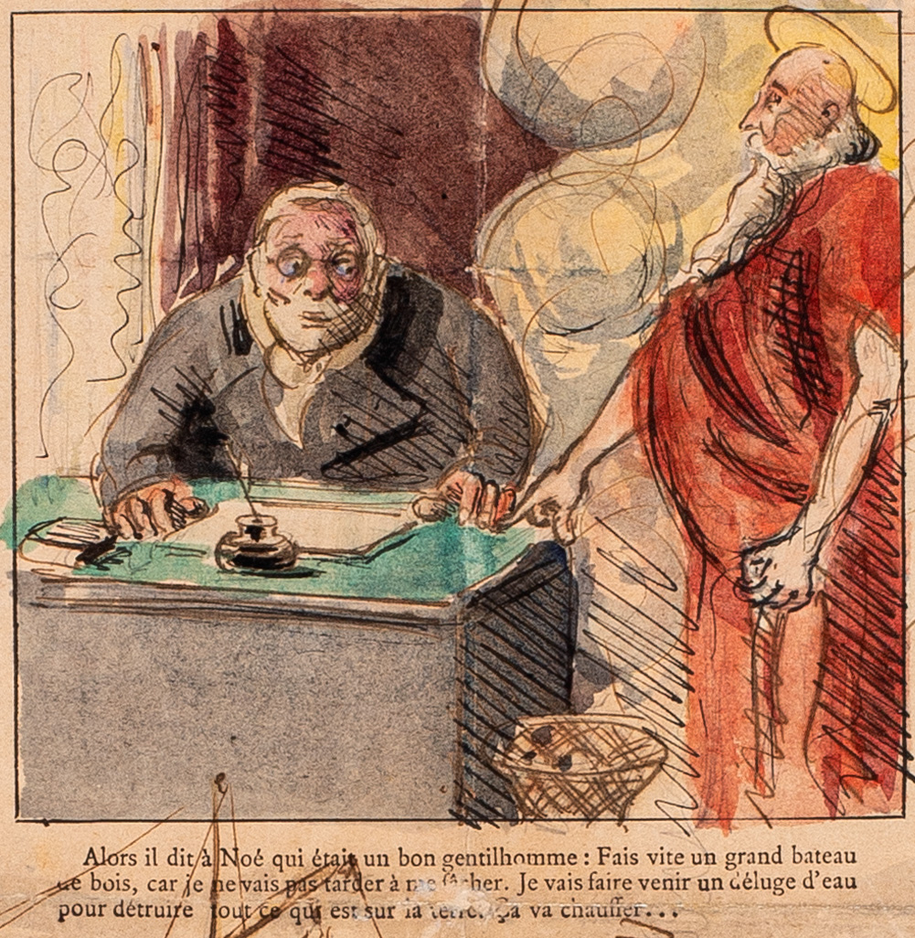 Le règlement du concours, paru dans l’édition du 2 janvier 1898, imposait que les candidats interprètent l’épisode biblique du déluge « comme s’il se passait de nos jours ». Le document se compose de 7 vignettes destinées à illustrer un petit texte. Observateur attentif de son époque, Dufy est sensible à l’actualité. Dans la première vignette, la scène de manifestation se rapporte ainsi vraisemblablement à la déchirure provoquée dans l’opinion publique par l’affaire Dreyfus. La bulle « À bas Zola » serait alors à mettre en lien avec l’engagement de l’écrivain pour la figure du capitaine à compter de 1897. Dans la troisième vignette, Dufy s’intéresse à l’étrange silhouette du bateau rouleur inventé par Ernest Bazin, dont les essais ont lieu en Basse-Seine puis dans la rade du Havre cette même année.